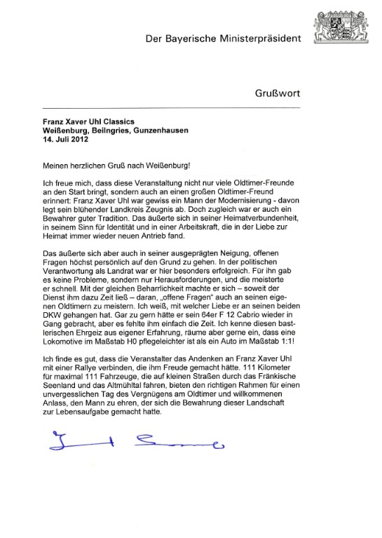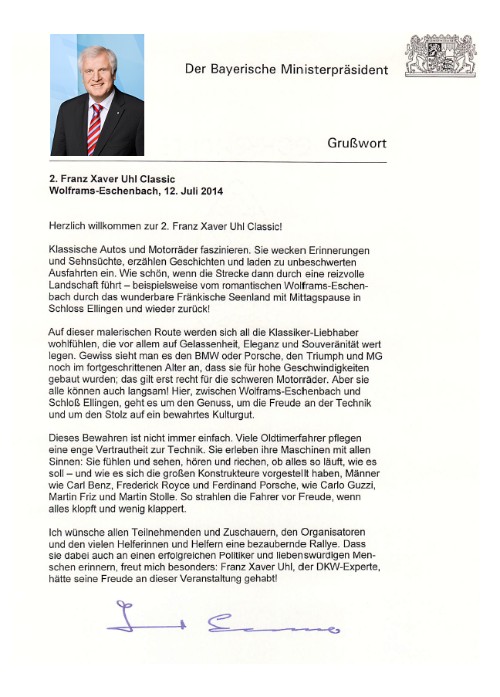 Schirmherr der 2. Franz Xaver Uhl Classic am 12. Juli 2014 ist der bayerische Ministerpräsident, Herr Horst Seehofer.